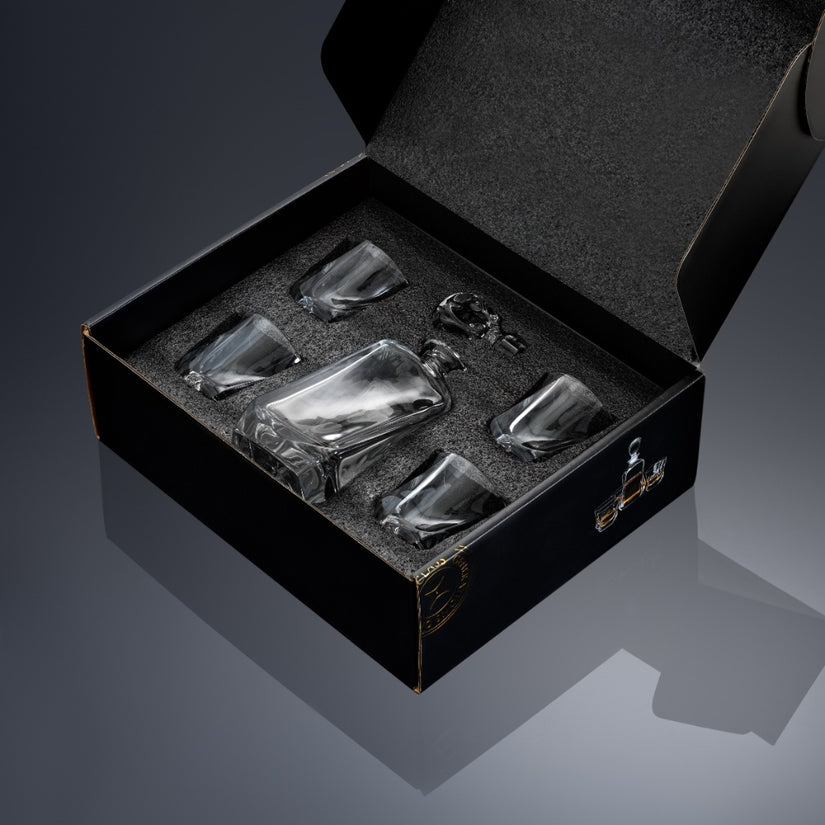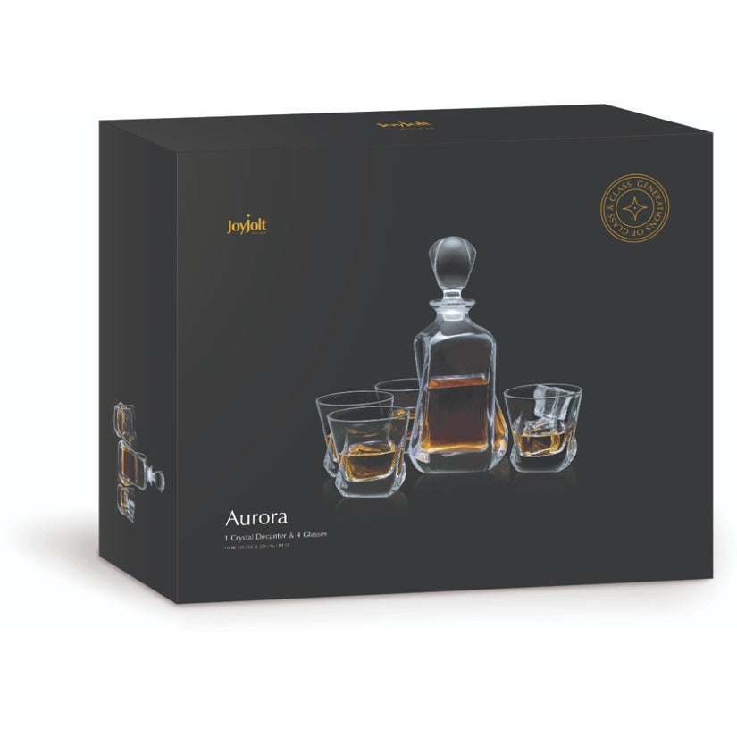 The Aurora Whiskey Decanter set has a stylish and minimalist design handmade by expert artisans with premium quality lead-free crystal. Great for bourbon, scotch, brandy, wine or water, the special bottle stopper will keep your liquor intense and flavorful and prevent it from evaporating. Includes a 25.3 Oz decanter and four 8.1 Oz whiskey glasses and comes in a beautiful gift box. Dishwasher Safe.