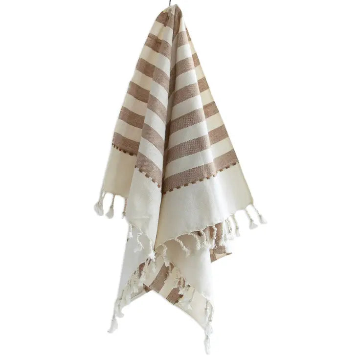 The tight weave of this fair trade hand towel makes it absorbent, soft, and remarkably lightweight. The wide tan stripes and natural fringe makes a daily household item a work of art while hung to dry in between use.