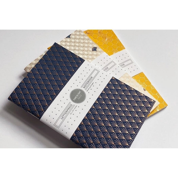 Our small pocket-sized notebook set features three geometric pattern designs, with rose gold foil stamping on coloured covers. Each set of 3 comes with a: seigaiha foil, deco foil, and honeycomb foil notebook. Beautiful small pocket-sized geometric designed notebook with blank pages.