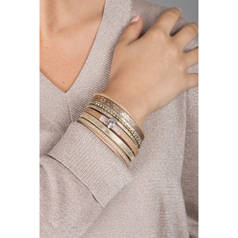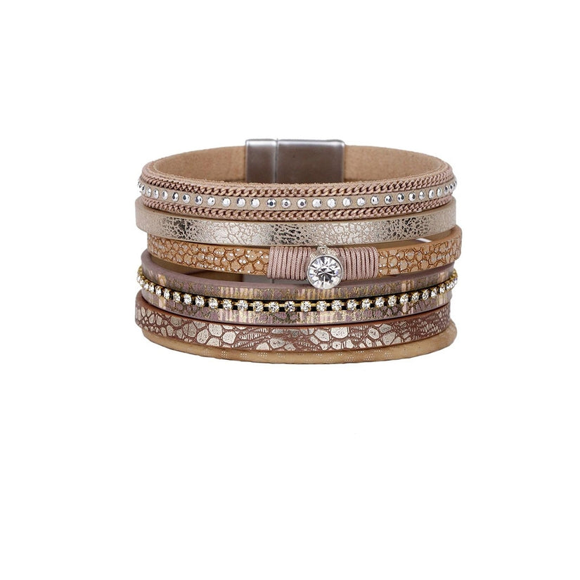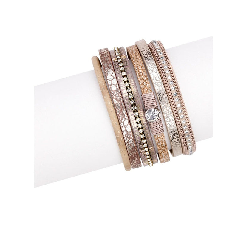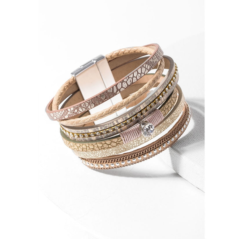 The New Majorca Bracelet is an eclectic array of diverse leather bands with a shiny centerpiece. The magnetic clasp makes adding this unique bracelet to your look easier than ever.